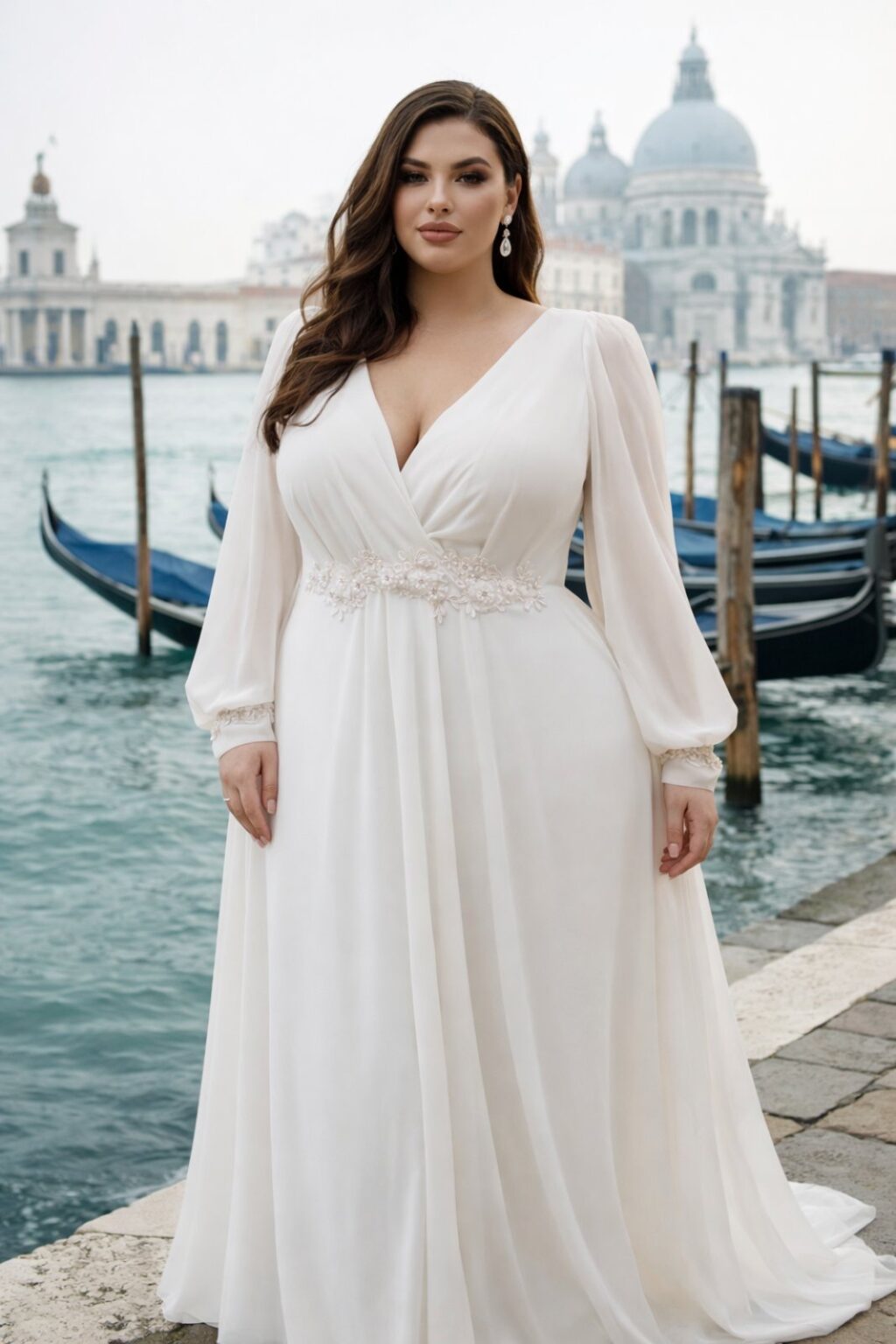 σύγχρονη νύφη. Το αέρινο ύφασμα χαρίζει μοναδική κίνηση και πολυτελή αίσθηση, ενώ η γραμμή του είναι ειδικά σχεδιασμένη για plus size σιλουέτες, αγκαλιάζοντας το σώμα με φυσικό και κολακευτικό τρόπο. Το ντεκολτέ σε σχήμα V αναδεικνύει διακριτικά το μπούστο, ενώ η απαλή σούρα κάτω από το στήθος προσφέρει τέλεια εφαρμογή και θηλυκότητα. Τα μακριά, ανάλαφρα μανίκια προσθέτουν μία αίσθηση ρομαντικής κομψότητας, ενώ η διακριτική δαντελένια λεπτομέρεια στη μέση τονίζει τη σιλουέτα και προσδίδει μία ιδιαίτερη couture πινελιά.