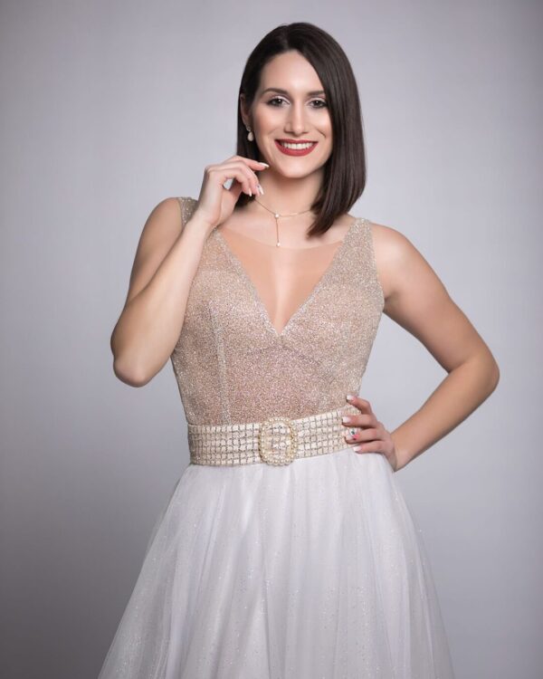 Νυφικό με μπούστο body από glitter με υπέροχο κράτημα στο στήθος. Το νυφικό έχει βαθύ ντεκολτέ καλλυμένο από τούλι film και πολύ εντυπωσιακή πλάτη με V πολύ αντοιχτό . Εντυπωσιακή φούστα σε άλφα γραμμή από γαλλικό τούλι με glitter, με αέρινη εφαρμογή. Το ντφικό διαθέτει ζώνη από glitter με εντυπωσιακή αγκράφα από πέρλες. Ένα νυφικό ευρωπαϊκής προέλευσης με εκλεπτυσμένο ύφασμα και υπέροχη εφαρμογή, ιδανικό για νύφες που θέλουν να εντυπωσιάσουν. Πολλές νύφες μας, μας έχουν εμπιστευτεί και έχουν αγοράσει με τις συμβουλές μας το νυφικό τους online. Βέβαια μπορείς πάντα να κλείσεις ραντεβού για πρόβα στο [email protected] για να επισκεφτείς το φυσικό μας κατάστημα και κέρδισε 10% έκπτωση.