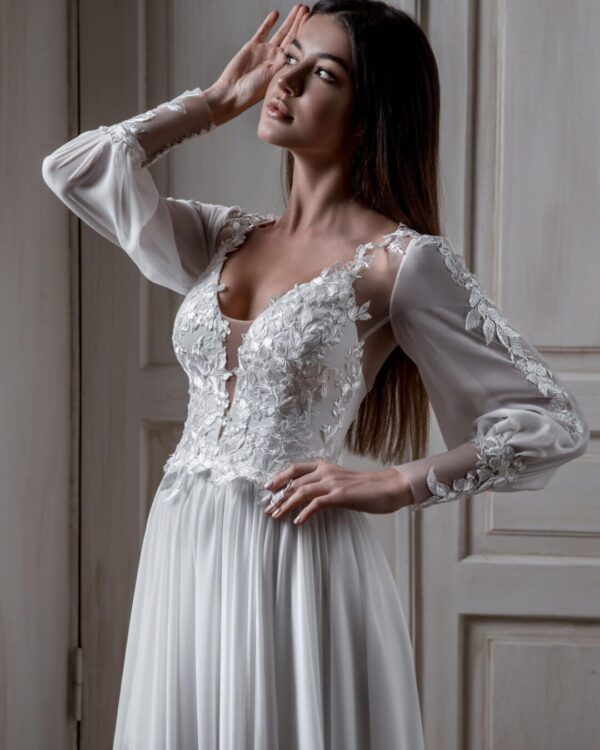 Νυφικό μεταξωτό σε αέρινη γραμμή με σκίσιμο μπροστά και κοντή επένδυση από μέσα, κεντημένο μπούστο με διαφάνεια τούλι σε σχήμα καρδιάς, φαρδύ μανίκι κεντημένο, πλάτη από τούλι κεντημένη με δαντέλα και λεπτομέρειες επάνω. Ένα elegant νυφικό που θα κλέψει την παράσταση. Πολλές νύφες μας, μας έχουν εμπιστευτεί και έχουν αγοράσει με τις συμβουλές μας το νυφικό τους online. Αν δεν είσαι σίγουρη για την εφαρμογή του μπορείς να κλείσεις ραντεβού για πρόβα στο [email protected] για να επισκεφτείς το φυσικό μας κατάστημα και κέρδισε 10% έκπτωση. Για οποιαδήποτε πληροφορία ή ραντεβού κάλεστε στο 22210 86623.