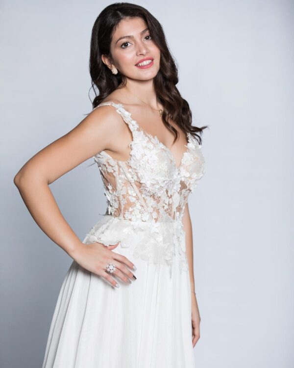 Νυφικό ολομέταξο με δαντέλα σε άλφα γραμμή. Το μπούστο είναι ολοκέντητο από 3D δαντέλα και παγιέτα, πλάτη με χιαστή δέσιμο σε off white χρώμα. Καλύπτει νούμερα M/L. Ένα ονειρεμένο ρομαντικό νυφικό για τη πιο σημαντική στιγμή της ζωής σου! Το νυφικό είναι μοναδικό και είναι μόνο προς πώληση, ώστε να είσαι σίγουρη ότι θα είναι μοναδικά ξεχωριστό όπως σου αρμόζει. Πολλές νύφες μας μας έχουν εμπιστευτεί και έχουν αγοράσει με τις συμβουλές μας το νυφικό τους online. Αν δεν είσαι σίγουρη για την εφαργαγή του μπορείς να κλείσεις ραντεβού για πρόβα στο [email protected] για να επισκεφτείς το φυσικό μας κατάστημα και κέρδισε 10% έκπτωση.