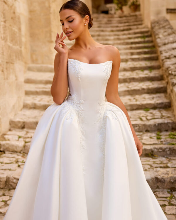 Κάθε λεπτομέρεια του φορέματος έχει σχεδιαστεί για να προσφέρει κομψότητα, ρομαντισμό και άψογη εφαρμογή, κάνοντάς το ιδανικό για κλασικούς, elegant ή luxurious γάμους. Το λεπτό κέντημα στο μπούστο και η υπέροχη ουρά χαρίζουν μια αίσθηση διαχρονικού μεγαλείου, τέλεια για τη νύφη που αναζητά την απόλυτη bridal εμπειρία.