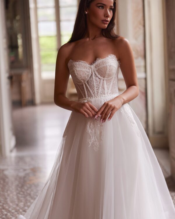 Νυφικό σε Α γραμμή με στράπλες ντεκολτέ. Με εντυπωσιακό τελείωμα στην φούστα.