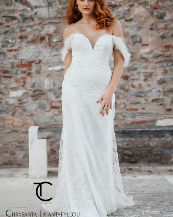 Nυφικό σε oλοκέντητη δαντέλα με πέρλα στην πιο elegance εκδοχή της, με λάμψη από γκλίτερ. Μπούστο καρδιά, με πούπουλα ριχτά στον ώμο. Κανονική εφαρμογή.