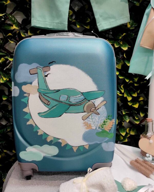 Ολοκληρωμένο πακέτο βάπτισης με θέμα αεροπλάνο, ζωγραφισμένο στο χέρι. Το πακέτο περιλαμβάνει τροχήλατη βαλίτσα, λαδόπανα, 3 κεράκια κολυμπήθρας, σαπουνάκι, μπουκαλάκι λαδιού, 50 μαρτυρικά και καλτσούλες.