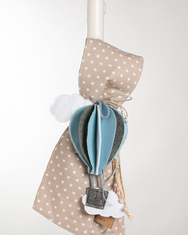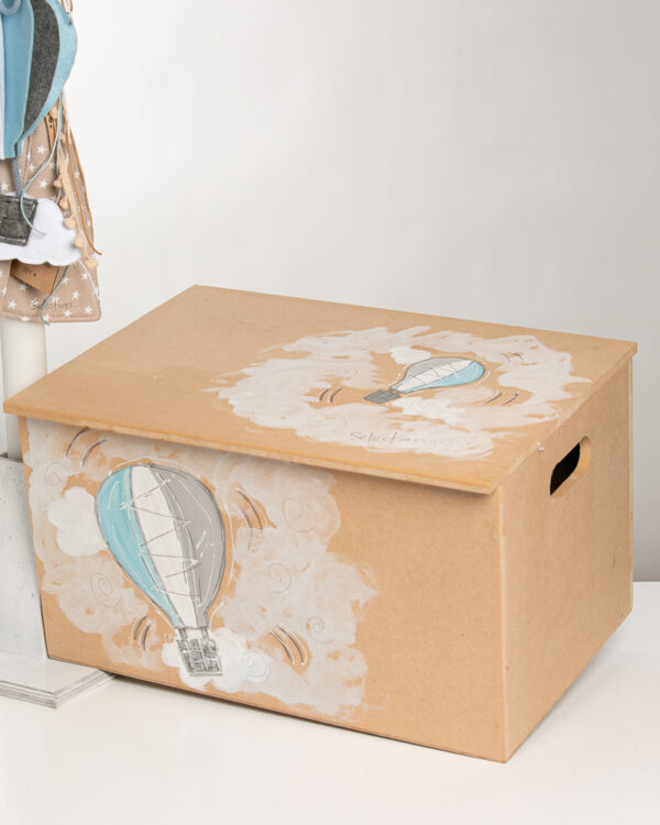 Ολοκληρωμένο πακέτο βάπτισης με θέμα αερόστατο. Το πακέτο περιλαμβάνει ξύλινο μπαούλο, λαδόπανα, 3 κεράκια κολυμπήθρας, σαπουνάκι, μπουκαλάκι λαδιού και 50 μαρτυρικά.
