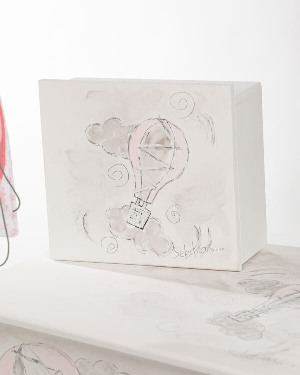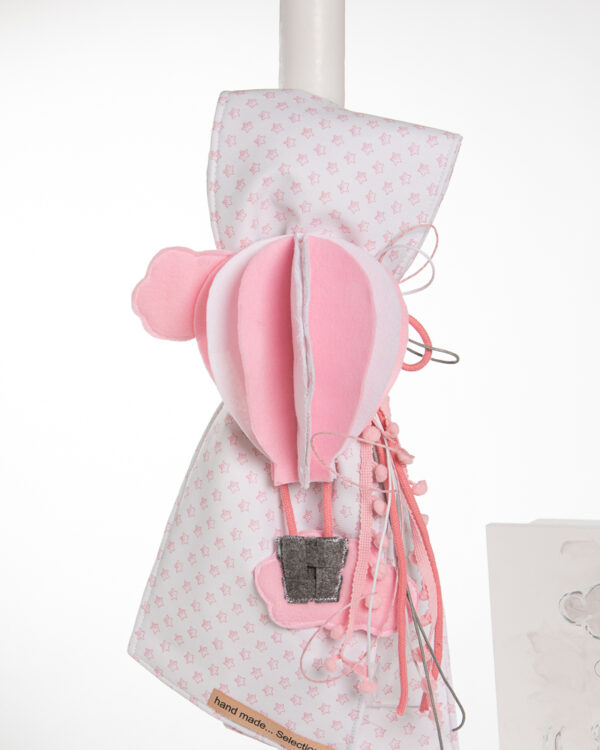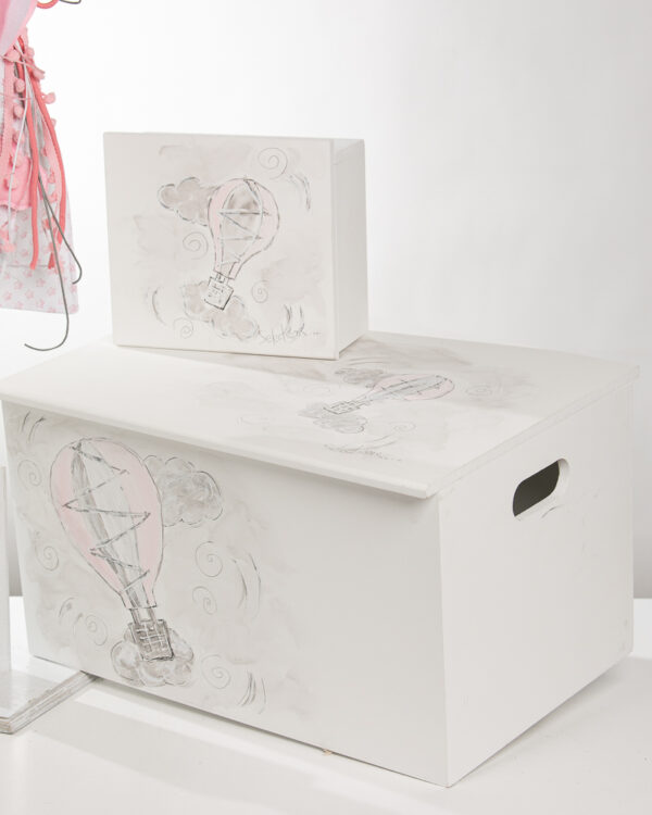 Ολοκληρωμένο πακέτο βάπτισης με θέμα αερόστατο. Το πακέτο περιλαμβάνει ξύλινο μπαούλο, λαδόπανα, 3 κεράκια κολυμπήθρας, σαπουνάκι, μπουκαλάκι λαδιού και 50 μαρτυρικά