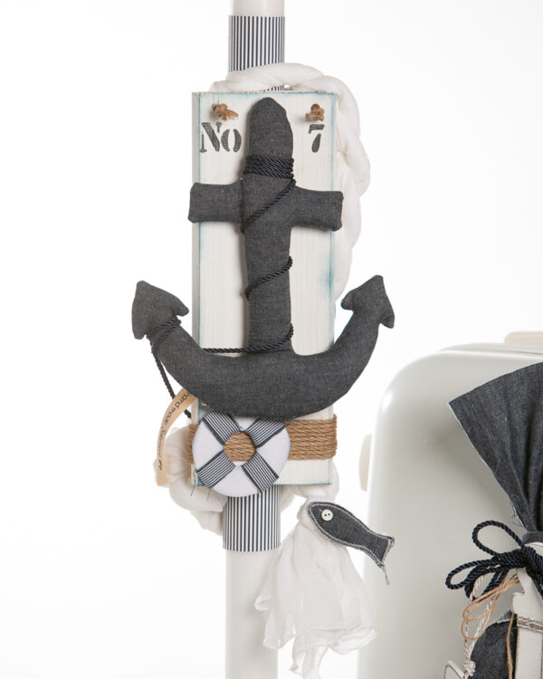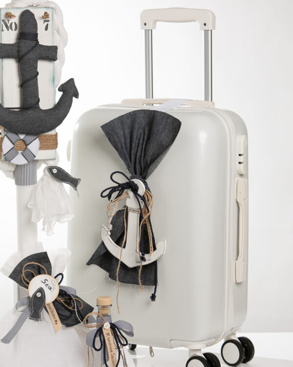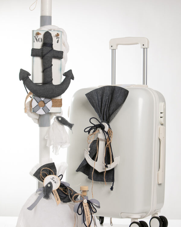 Ολοκληρωμένο πακέτο βάπτισης με θέμα άγκυρα.Το πακέτο περιλαμβάνει τροχήλατη βαλίτσα, λαδόπανα, 3 κεράκια κολυμπήθρας, σαπουνάκι, μπουκαλάκι λαδιού και 50 μαρτυρικά.