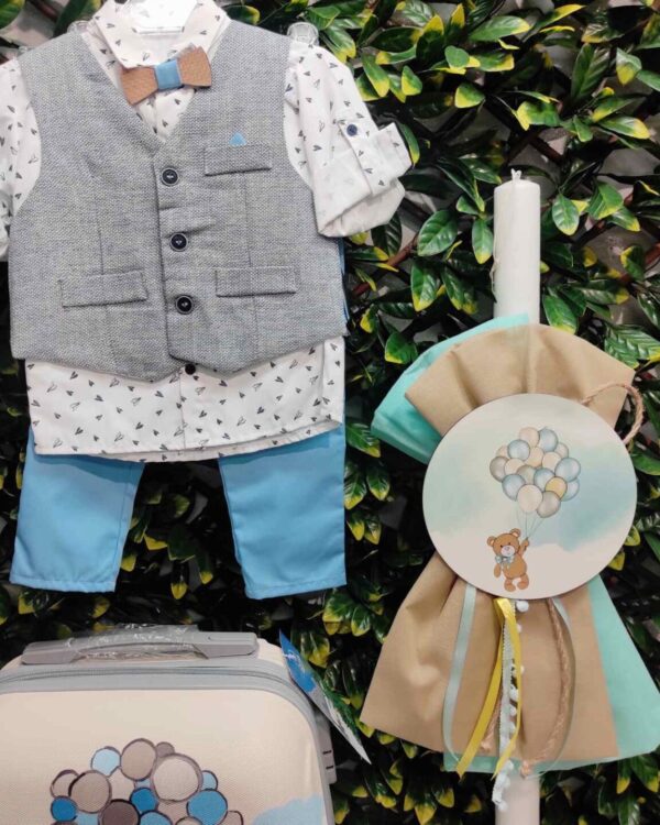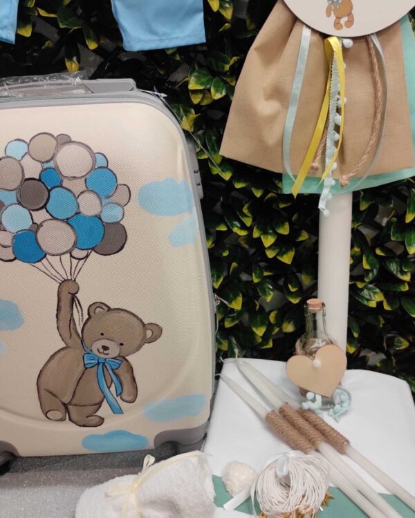 Ολοκληρωμένο πακέτο βάπτισης με θέμα αρκουδάκι, ζωγραφισμένο στο χέρι. Το πακέτο περιλαμβάνει τροχήλατη βαλίτσα, λαδόπανα, 3 κεράκια κολυμπήθρας, σαπουνάκι, μπουκαλάκι λαδιού, 50 μαρτυρικά και καλτσούλες.