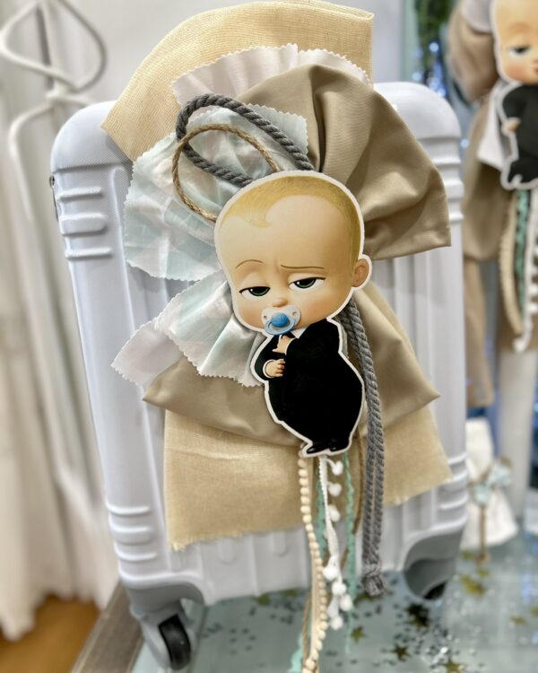 Ολοκληρωμένο πακέτο βάπτισης με θέμα Baby Boss. Το πακέτο περιλαμβάνει τροχήλατη βαλίτσα, λαδόπανα, 3 κεράκια κολυμπήθρας, σαπουνάκι, μπουκαλάκι λαδιού και 50 μαρτυρικά. Επίσης περιέχει το ρούχο και παπούτσι της επιλογησ σας (για το συγκεκριμένο ρούχο και παπούτσι να προηγηθεί τηλεφωνική επικοινωνία ).