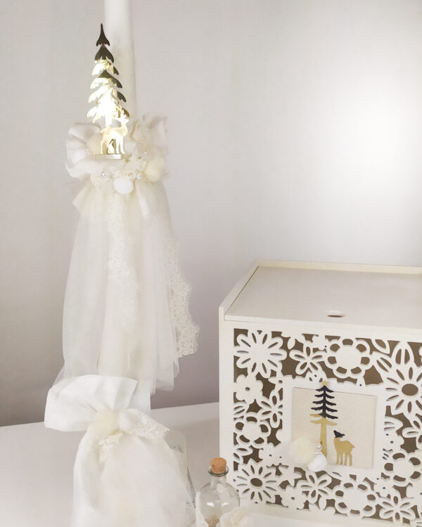 Ολοκληρωμένο πακέτο βάπτισης με θέμα Christmas. Το πακέτο περιλαμβάνει ξύλινο μπαούλο, λαδόπανα, 3 κεράκια κολυμπήθρας, σαπουνάκι, μπουκαλάκι λαδιού και 50 μαρτυρικά.