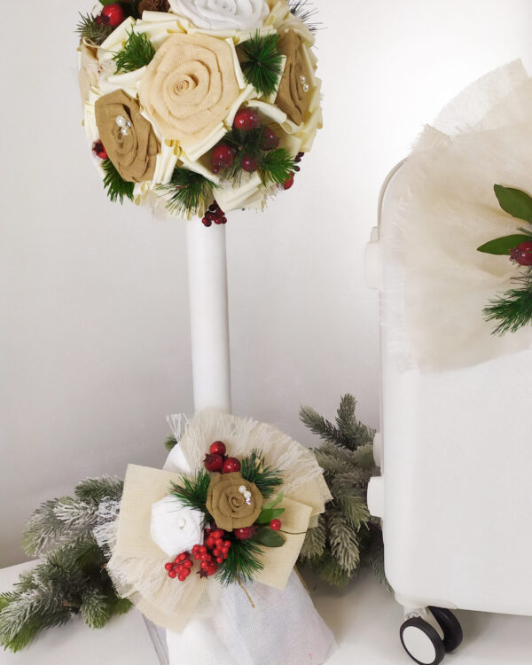 Ολοκληρωμένο πακέτο βάπτισης με θέμα Χριστουγεννιάτικη ανθοδέσμη. Το πακέτο περιλαμβάνει τροχήλατη βαλίτσα, λαδόπανα, 3 κεράκια κολυμπήθρας, σαπουνάκι, μπουκαλάκι λαδιού και 50 μαρτυρικά.