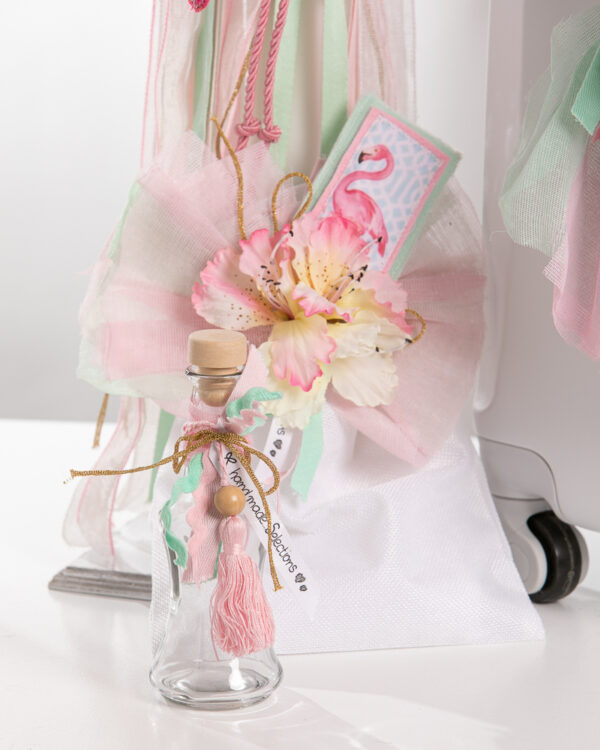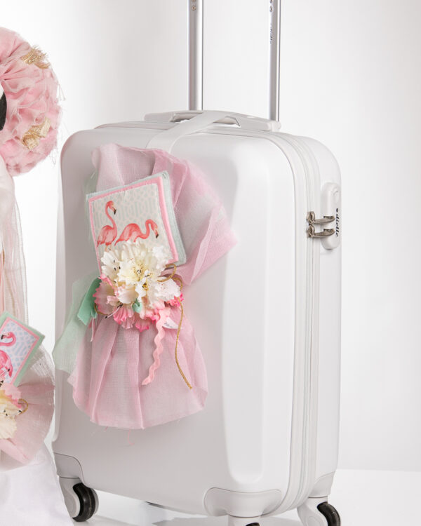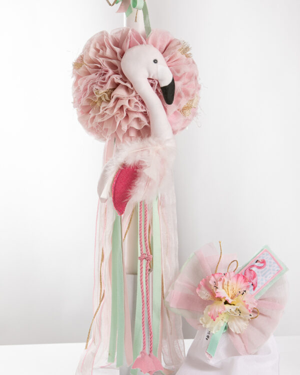 Ολοκληρωμένο πακέτο βάπτισης με θέμα flamingo. Το πακέτο περιλαμβάνει τροχήλατη βαλίτσα, λαδόπανα, 3 κεράκια κολυμπήθρας, σαπουνάκι, μπουκαλάκι λαδιού και 50 μαρτυρικά