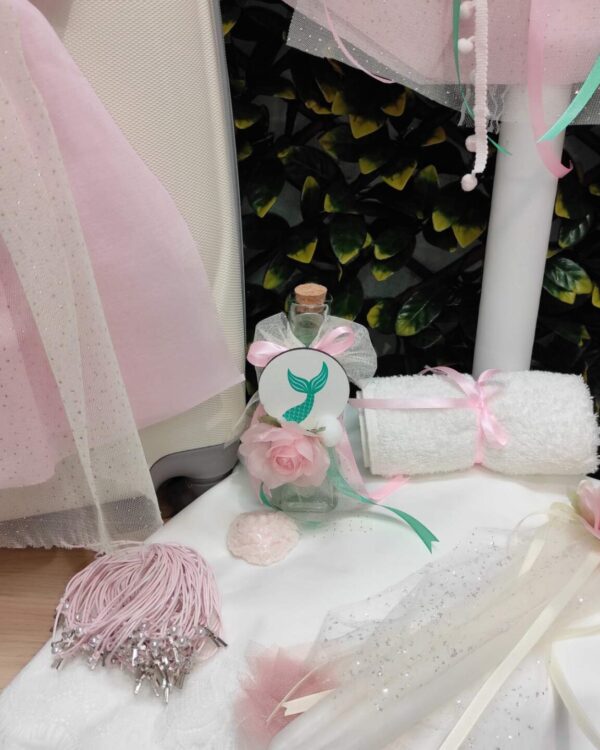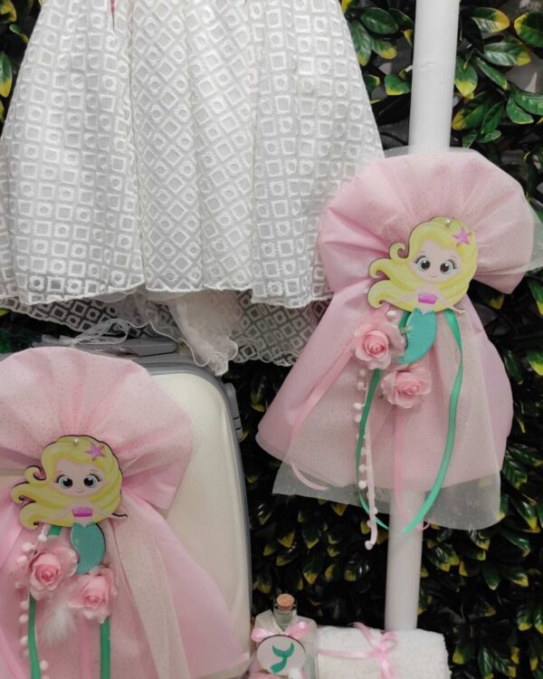 Ολοκληρωμένο πακέτο βάπτισης με θέμα γοργόνα. Το πακέτο περιλαμβάνει τροχήλατη βαλίτσα, λαδόπανα, 3 κεράκια κολυμπήθρας, σαπουνάκι, μπουκαλάκι λαδιού, 50 μαρτυρικά και καλτσούλες.