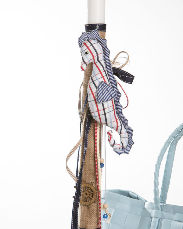 Ολοκληρωμένο πακέτο βάπτισης με θέμα ιππόκαμπος. Το πακέτο περιλαμβάνει τσάντα, λαδόπανα, 3 κεράκια κολυμπήθρας, σαπουνάκι, μπουκαλάκι λαδιού και 50 μαρτυρικά.