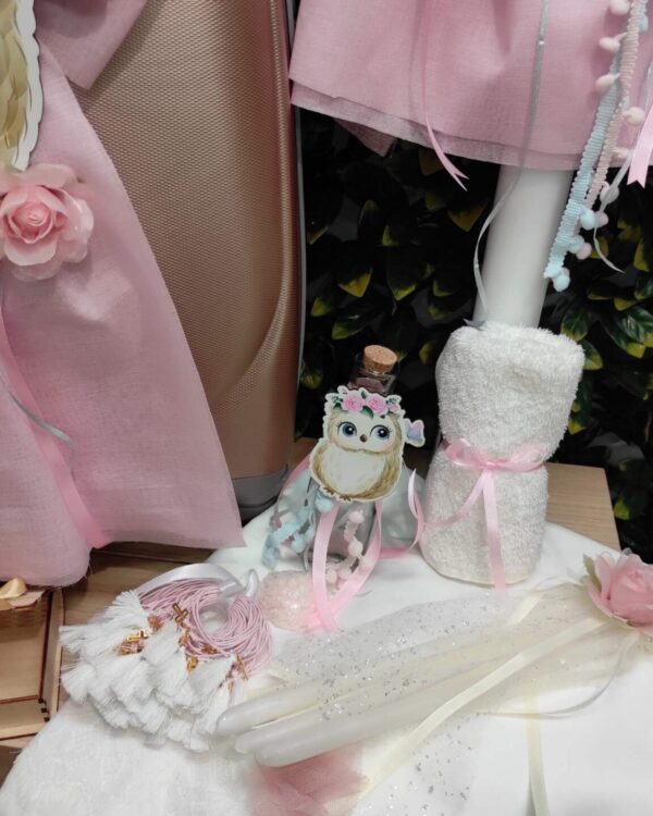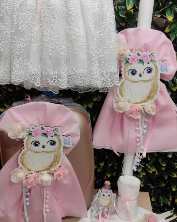 Ολοκληρωμένο πακέτο βάπτισης με θέμα κουκουβάγια. Το πακέτο περιλαμβάνει τροχήλατη βαλίτσα, λαδόπανα, 3 κεράκια κολυμπήθρας, σαπουνάκι, μπουκαλάκι λαδιού, 50 μαρτυρικά και καλτσούλες.