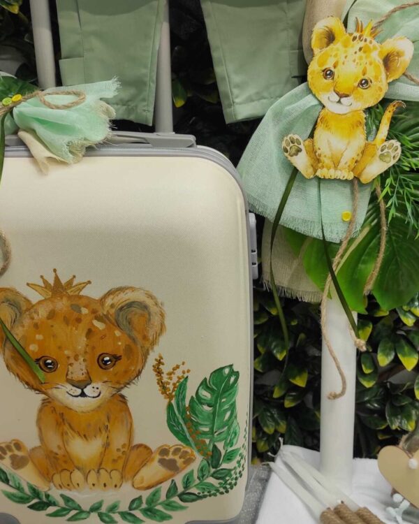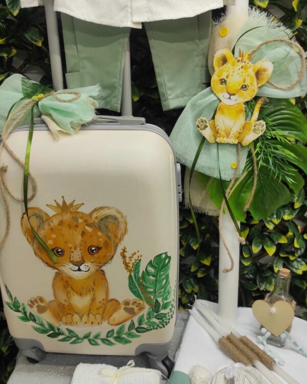 Ολοκληρωμένο πακέτο βάπτισης με θέμα λιονταράκι, ζωγραφισμένο στο χέρι. Το πακέτο περιλαμβάνει τροχήλατη βαλίτσα, λαδόπανα, 3 κεράκια κολυμπήθρας, σαπουνάκι, μπουκαλάκι λαδιού, 50 μαρτυρικά και καλτσούλες.