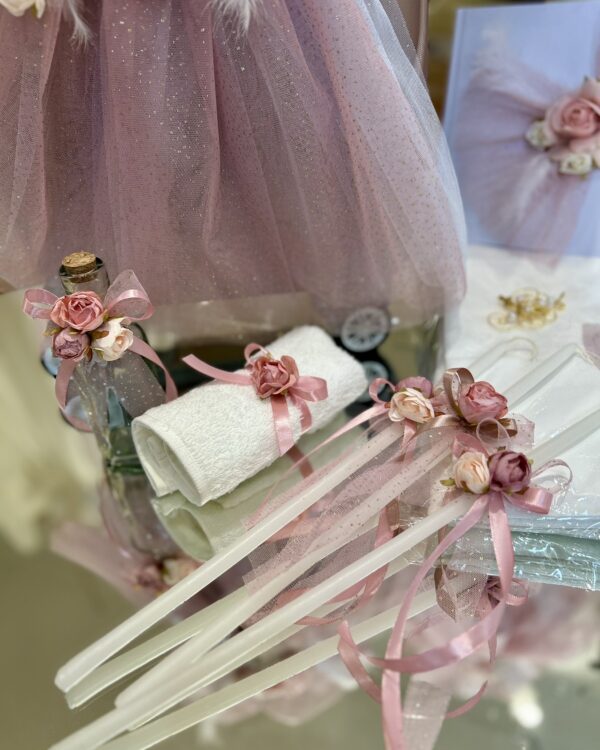Ολοκληρωμένο πακέτο βάπτισης με λουλούδια. Το πακέτο περιλαμβάνει τροχήλατη βαλίτσα, λαδόπανα, 3 κεράκια κολυμπήθρας, σαπουνάκι, μπουκαλάκι λαδιού, 50 μαρτυρικά και βιβλίο ευχών. Επίσης περιέχει το ρούχο και παπούτσι της επιλογησ σας .
