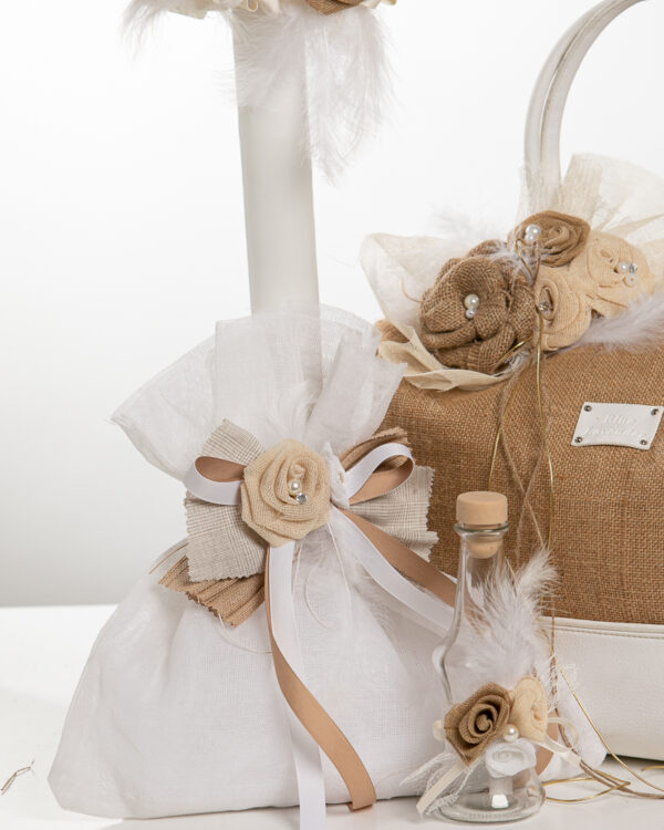 Ολοκληρωμένο πακέτο βάπτισης με θέμα σχέδιο ανθοδέσμη. Το πακέτο περιλαμβάνει δερμάτινη τσάντα, λαδόπανα, 3 κεράκια κολυμπήθρας, σαπουνάκι, μπουκαλάκι λαδιού και 50 μαρτυρικά