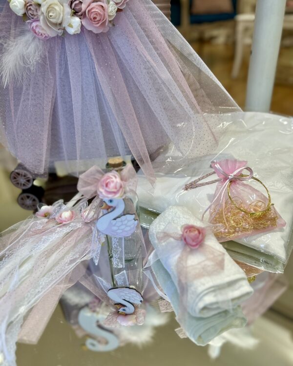 Ολοκληρωμένο πακέτο βάπτισης με θέμα Κύκνος. Το πακέτο περιλαμβάνει τροχήλατη βαλίτσα, λαδόπανα, 3 κεράκια κολυμπήθρας, σαπουνάκι, μπουκαλάκι λαδιού, 50 μαρτυρικά . Επίσης περιέχει το ρούχο και παπούτσι της επιλογησ σας .
