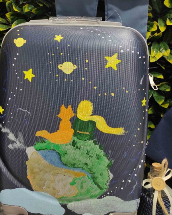 Ολοκληρωμένο πακέτο βάπτισης με θέμα μικρός πρίγκιπας, ζωγραφισμένο στο χέρι. Το πακέτο περιλαμβάνει τροχήλατη βαλίτσα, λαδόπανα, 3 κεράκια κολυμπήθρας, σαπουνάκι, μπουκαλάκι λαδιού και 50 μαρτυρικά.