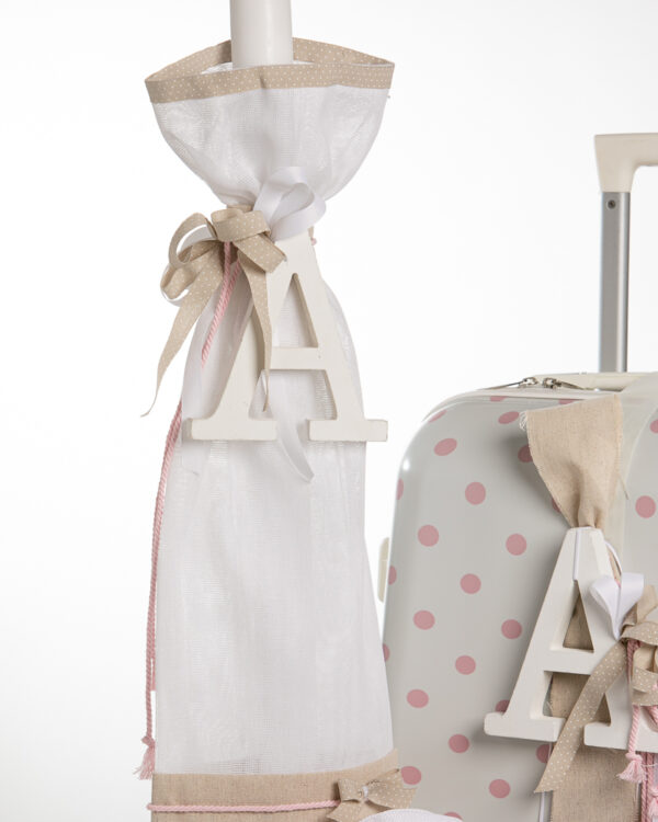 Ολοκληρωμένο πακέτο βάπτισης με θέμα μονόγραμμα. Το πακέτο περιλαμβάνει τροχήλατη βαλίτσα, λαδόπανα, 3 κεράκια κολυμπήθρας, σαπουνάκι, μπουκαλάκι λαδιού και 50 μαρτυρικά