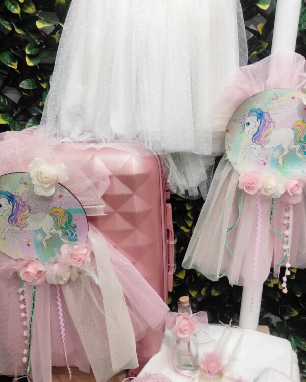 Ολοκληρωμένο πακέτο βάπτισης με θέμα μονόκερος. Το πακέτο περιλαμβάνει τροχήλατη βαλίτσα, λαδόπανα, 3 κεράκια κολυμπήθρας, σαπουνάκι, μπουκαλάκι λαδιού, 50 μαρτυρικά και καλτσούλες.