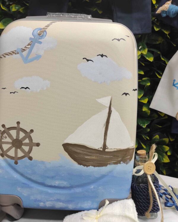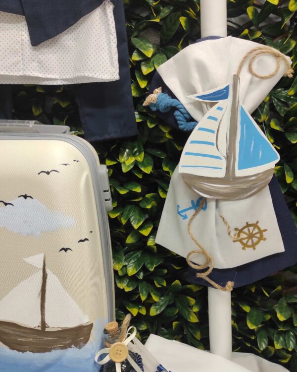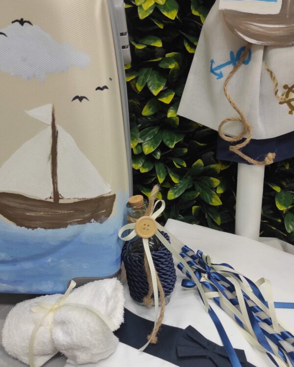 Ολοκληρωμένο πακέτο βάπτισης με ναυτικό, ζωγραφισμένο στο χέρι. Το πακέτο περιλαμβάνει τροχήλατη βαλίτσα, λαδόπανα, 3 κεράκια κολυμπήθρας, σαπουνάκι, μπουκαλάκι λαδιού και 50 μαρτυρικά.