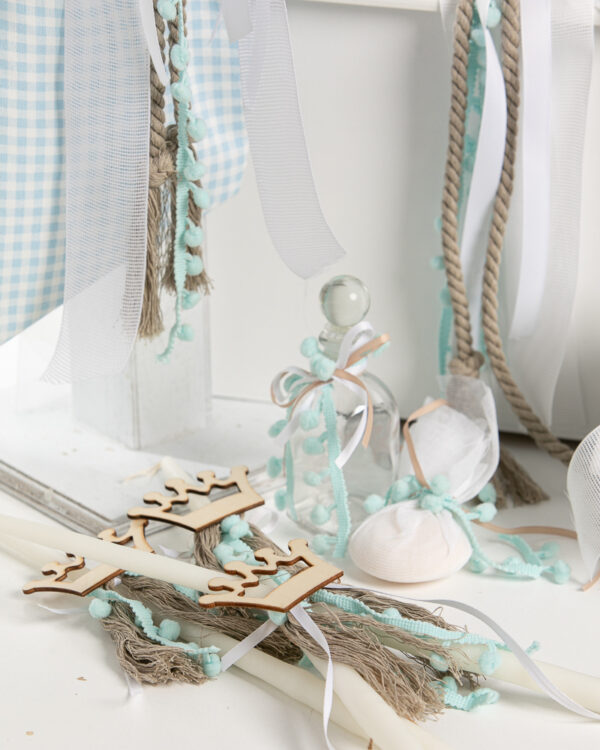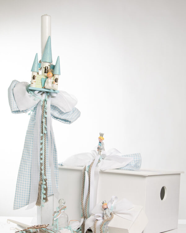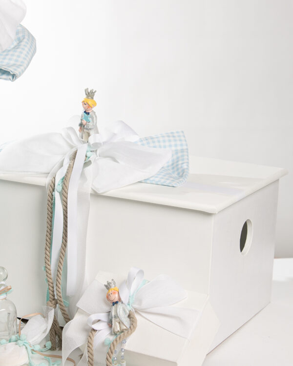 Ολοκληρωμένο πακέτο βάπτισης με θέμα πρίγκιπας.Το πακέτο περιλαμβάνει ξύλινο μπαούλο, λαδόπανα, 3 κεράκια κολυμπήθρας, σαπουνάκι, μπουκαλάκι λαδιού και 50 μαρτυρικά.