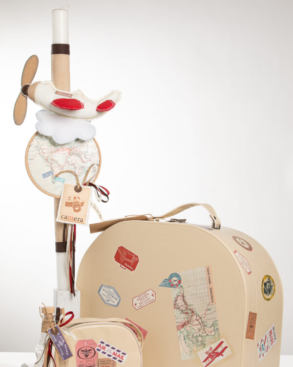 Ολοκληρωμένο πακέτο βάπτισης με θέμα red traveller. Το πακέτο περιλαμβάνει βαλίτσα, λαδόπανα, 3 κεράκια κολυμπήθρας, σαπουνάκι, μπουκαλάκι λαδιού και 50 μαρτυρικά. Διαθέσιμο και σε μπεζ
