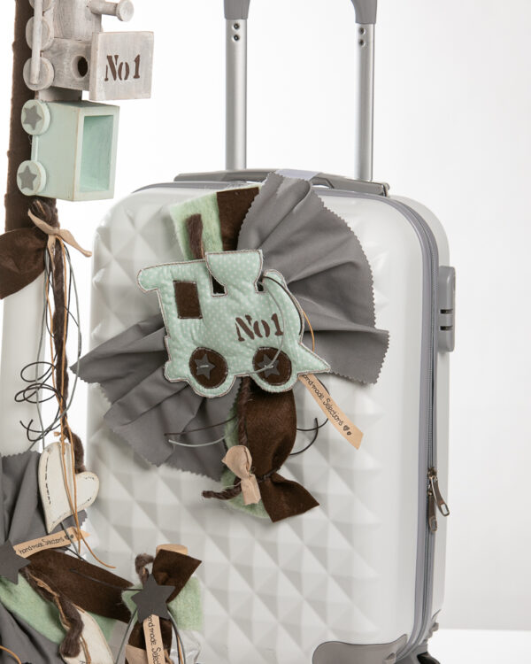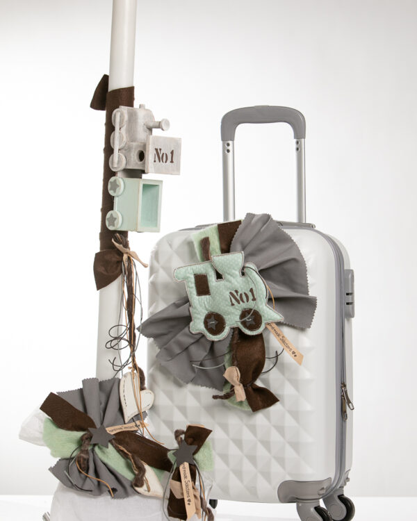 Ολοκληρωμένο πακέτο βάπτισης με θέμα τρένο.Το πακέτο περιλαμβάνει τροχήλατη βαλίτσα, λαδόπανα, 3 κεράκια κολυμπήθρας, σαπουνάκι, μπουκαλάκι λαδιού και 50 μαρτυρικά.