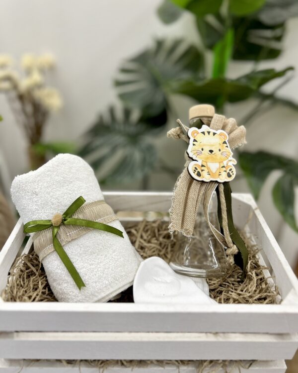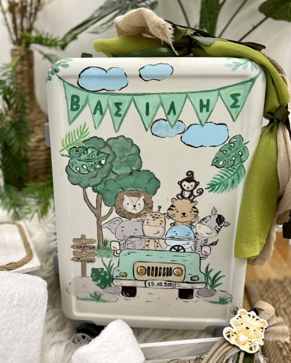 Ολοκληρωμένο πακέτο βάπτισης με θέμα Ζωάκια της ζούγκλας. Το πακέτο περιλαμβάνει τροχήλατη βαλίτσα, λαδόπανα, 3 κεράκια κολυμπήθρας, σαπουνάκι, μπουκαλάκι λαδιού και 50 μαρτυρικά.