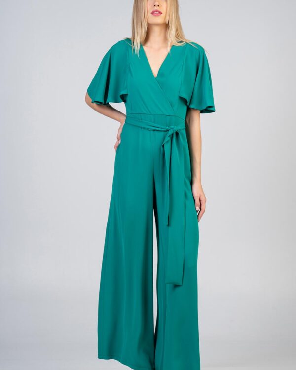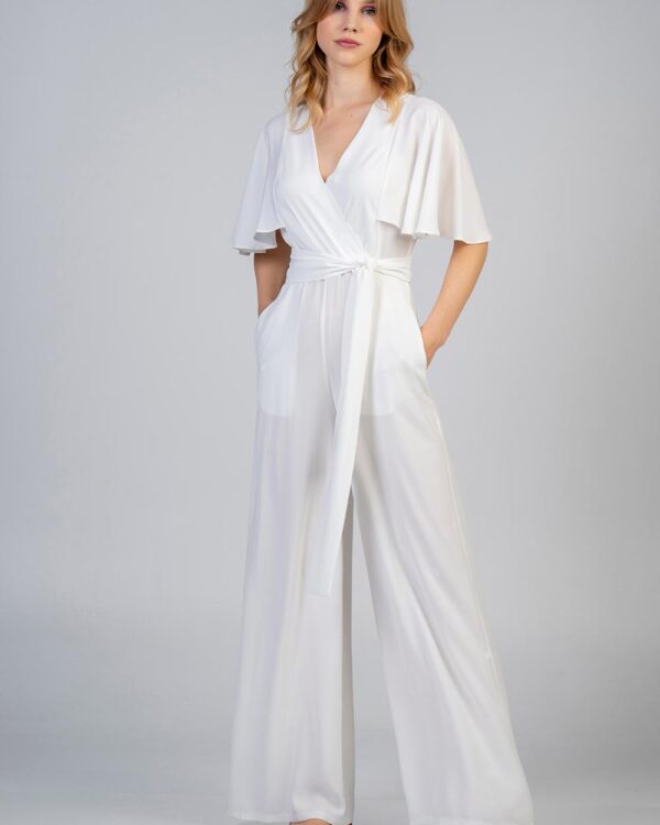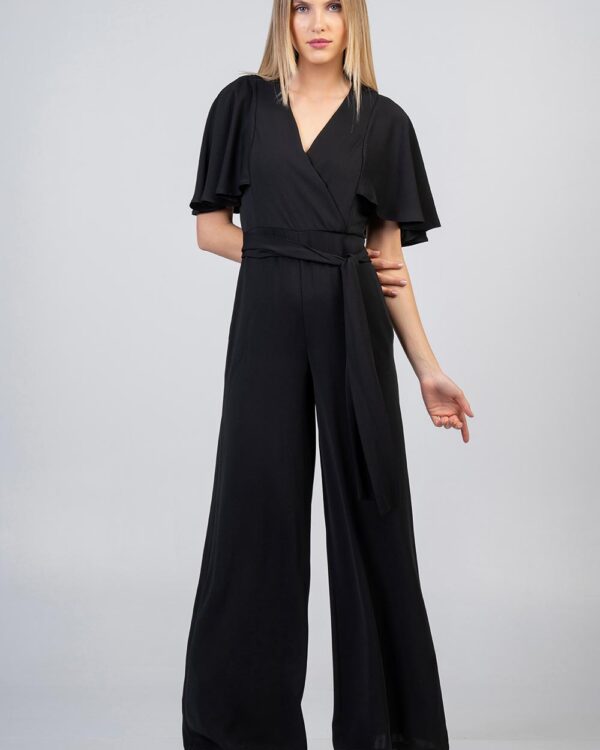 Ολόσωμη φόρμα σε κρεπ ύφασμα σε σχέδιο κρουαζέ εμπρός με βολάν μανίκι και κρυφό φερμουάρ πίσω με κουμπάκι. Κανονική εφαρμογή – ίσια γραμμή.