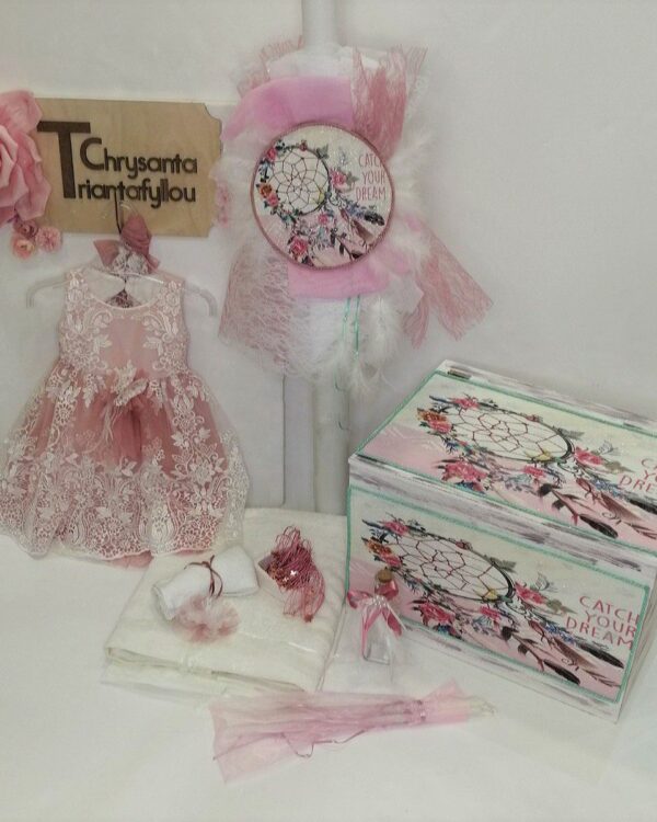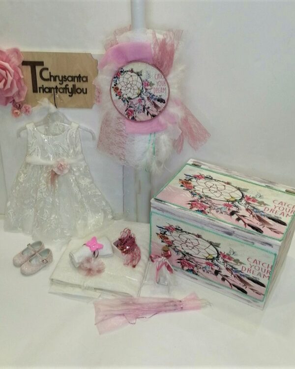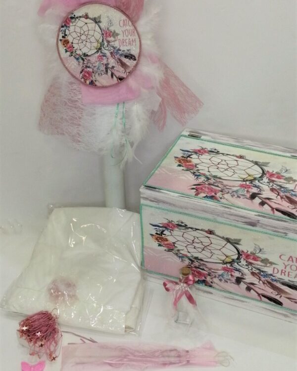 Επίλεξε τη βάπτιση με θέμα την ονειροπαγίδα, με ινδιάνικα στοιχεία και floral διακόσμηση. Διάλεξε το μοτίβο, το είδος προσκλητηρίου εδώ, την μπομπονιέρα εδώ και το πλήρες σετ βάπτισης με παγκάκι εδώ ή με δερμάτινη βαλίτσα εδώ , βάλτα στο καλάθι αγορών σου μαζί με αυτό το θέμα και εμείς θα εφαρμόσουμε το θέμα παντού! Το εικαστικό μπορεί να εφαρμοστεί ως προσκλητήριο στα παρακάτω προϊόντα: Μονόκαρτο με exlusive προσωποποιημένο φάκελο (κάρτα: 14,5Χ20εκ – φάκελος: 15Χ21εκ), Παζλ 12 τμχ με εκτυπωμένο κουτί (puzzle: 12Χ17εκ – box: 12Χ12X4εκ), Ξύλινο καδράκι με κάλεσμα σε ρολάκι (τετράγωνο: 12,5×12,5εκ – στρογγυλό: Φ12εκ).