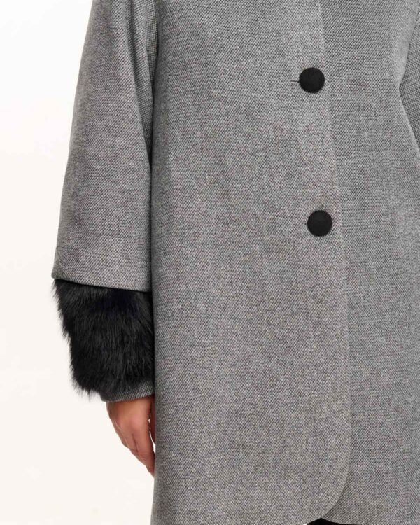 Παλτό με κουκούλα και αποσπώμενη γούνα στα μανίκια. Κουμπώνει με κουμπιά . Είναι ελληνικής κατασκευής .