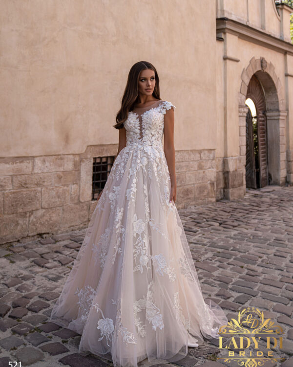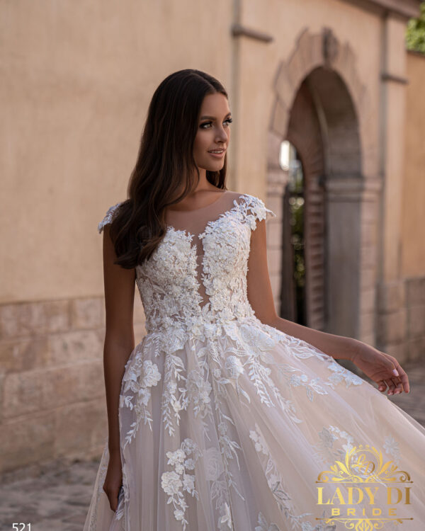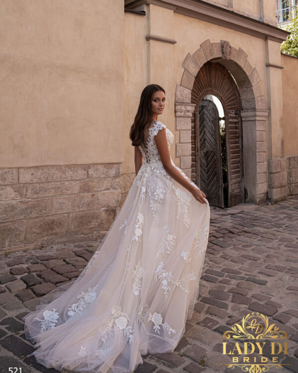 Πανέμορφο νυφικό με μαγευτική ουρά διακοσμημένη με περίτεχνα κεντήματα που απλώνονται αρμονικά κατά μήκος του φορέματος.