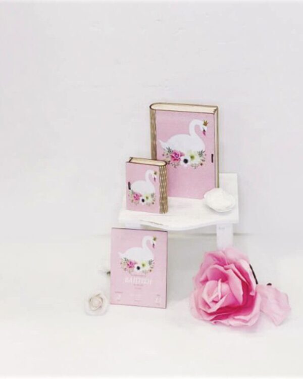 Πλήρες σετ βάπτισης με θέμα τον κύκνο και με εκρού τροχήλατη βαλίτσα ταξιδιού. Το σετ περιλαμβάνει στολισμένη βαλίτσα, στολισμό λαμπάδας (δεν συμπεριλαμβάνεται το κερί), 50 μαρτυρικά, 3 κεράκια στολισμένα, μπουκαλάκι λαδιού, σαπουνάκια, πετσέτες, σετ λαδόπανα και εσώρουχα. Τα ξύλινα διακοσμητικά στοιχεία είναι με ψηφιακή έγχρωμη εκτύπωση στο ίδιο θέμα. Το σετ κουτί βάφτισης είναι χειροποίητο και χρειάζεται 10-12 μέρες παράδοσης.