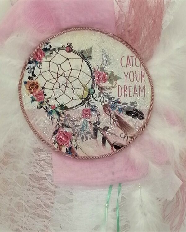 Πλήρες σετ βάπτισης με παγκάκι και θέμα την Ονειροπαγίδα, στις αποχρώσεις λευκό με ροζ, συνδυασμένο με φόρεμα και παπουτσάκι της επιλογής σας, δες εδώ τη συλλογή ρούχων και εδώ τα παπουτσάκια. Το σετ περιλαμβάνει διακόσμηση λαμπάδας (χωρίς το κερί), κουτί παγκάκι με αποθηκευτικό χώρο, διακοσμημένο με χειροποίητη Ονειροπαγίδα και επιγραφή “Catch yoyr Dreams”, λουλουδάκια και δαντέλες, λαδόπανα, πετσέτες, εσώρουχα, 50 μαρτυρικά, 3 κεράκια, σαπουνάκια, φόρεμα και παπουτσάκι της αρεσκείας σας. Όλο το σετ είναι χειροποίητο και ζωγραφισμένο στο χέρι, χρειάζεται 10-12 μέρες παράδοσης. Με το πλήρες σετ με φόρεμα και παπούτσι επωφελείστε με 15% έκπτωση στο σύνολο!
