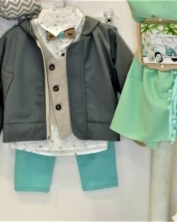 Πλήρες σετ βάπτισης με παγκάκι και θέμα Vintage Van & Surfing, συνδυασμένο με ρούχο. Το σετ περιλαμβάνει το βαπτιστικό ρούχο μαζί με παλτό, καπέλο, παγκάκι με αποθηκευτικό χώρο, ζωγραφισμένο στο χέρι, στολισμός λαμπάδας με το ίδιο θέμα σε ξύλινο διακοσμητικό (δεν συμπεριλαμβάνεται το κερί), 50 μαρτυρικά, 3 κεράκια, μπουκαλάκι λαδιού, σαπουνάκια, πετσέτες, σετ λαδόπανα και εσώρουχα. Το σετ κουτί βάφτισης είναι χειροποίητο και ζωγραφισμένο στο χέρι και χρειάζεται 10-12 μέρες παράδοσης.