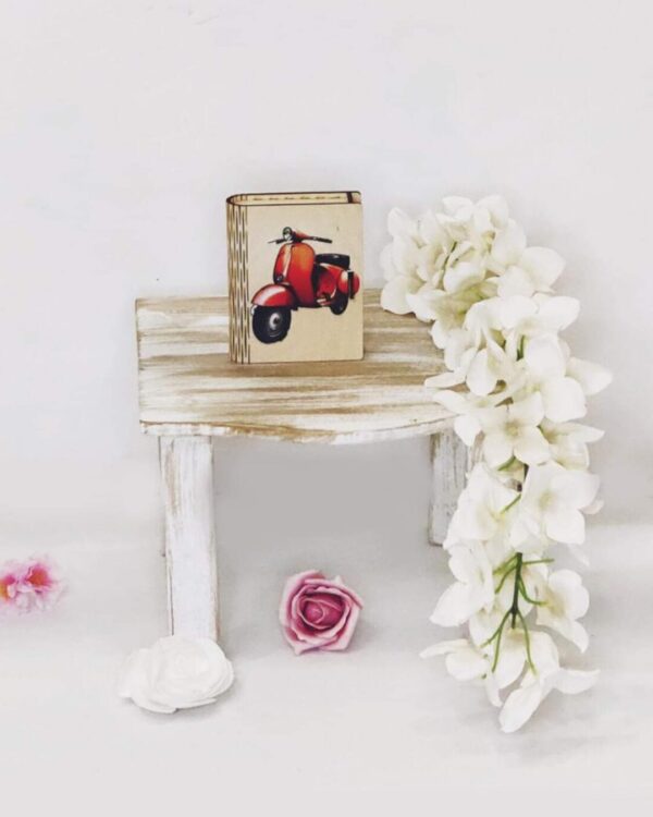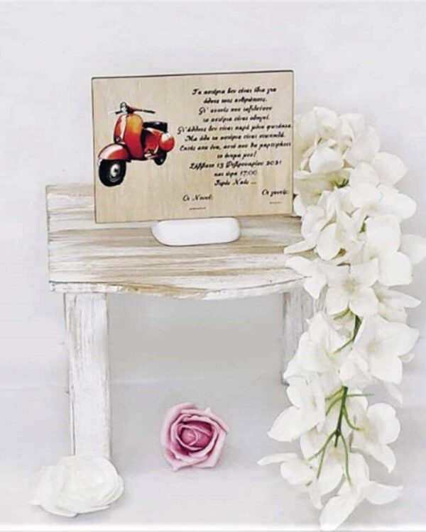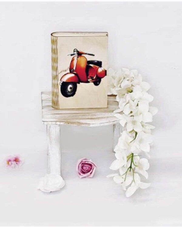 Πλήρες σετ βάπτισης με θέμα την Βέσπα σε κόκκινο, με λευκή δερμάτινη βαλίτσα. Το σετ περιλαμβάνει τη δερμάτινη βαλίτσα στολισμένη, στολισμό λαμπάδας (δεν συμπεριλαμβάνεται το κερί), 50 μαρτυρικά με ξύλινο κουτί στο θέμα σας (ύψος 20εκ. πλάτος 15εκ), 3 κεράκια στολισμένα, μπουκαλάκι λαδιού, σαπουνάκια, πετσέτες, σετ λαδόπανα και εσώρουχα. Τα ξύλινα διακοσμητικά στοιχεία και το κουτί μαρτυρικών είναι με ψηφιακή έγχρωμη εκτύπωση στο ίδιο θέμα. Το σετ κουτί βάφτισης είναι χειροποίητο και χρειάζεται 10-12 μέρες παράδοσης.