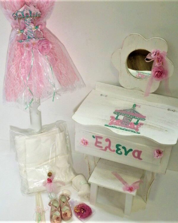 Πλήρες σετ βάπτισης με θέμα το καρουζέλ στις αποχρώσεις λευκό με ροζ, συνδυασμένο με φόρεμα και παπουτσάκι της επιλογής σας, δες εδώ τη συλλογή ρούχων και εδώ τα παπουτσάκια. Το σετ περιλαμβάνει διακόσμηση λαμπάδας (χωρίς το κερί), παγκάκι διακοσμημένο με χειροποίητη ζωγραφιά κύκνο, λουλουδάκια και δαντέλες, λαδόπανα, πετσέτες, εσώρουχα, 50 μαρτυρικά, 3 κεράκια, σαπουνάκια, φόρεμα και παπουτσάκι της αρεσκείας σας. Όλο το σετ είναι χειροποίητο και ζωγραφισμένο στο χέρι, χρειάζεται 10-12 μέρες παράδοσης. Με το πλήρες σετ με φόρεμα και παπούτσι επωφελείστε με 15% έκπτωση στο σύνολο!