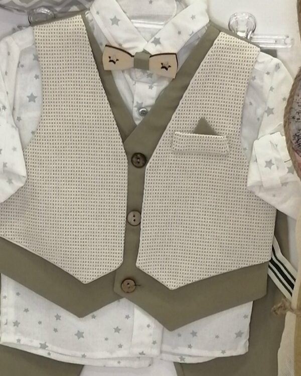 Σετ βάπτισης με βέσπα και θέμα ταξίδια, ο γύρος του κόσμου με ένα αεροπλάνο. Το σετ περιλαμβάνει το βαπτιστικό ρούχο σε γήινες αποχρώσεις του χακί, ξύλινη βέσπα με αποθηκευτικό χώρο, ζωγραφισμένη με τον παγκόσμιο χάρτη σε αποχρώσεις του καφέ, με τεχνική decoupage, στολισμός λαμπάδας με το ίδιο θέμα σε ξύλινο στρογγυλό διακοσμητικό (δεν συμπεριλαμβάνεται το κερί), 50 μαρτυρικά, 3 κεράκια, μπουκαλάκι λαδιού, σαπουνάκια, πετσέτες, σετ λαδόπανα και εσώρουχα. Το σετ κουτί βάφτισης είναι χειροποίητο και ζωγραφισμένο στο χέρι και χρειάζεται 10-12 μέρες παράδοσης.