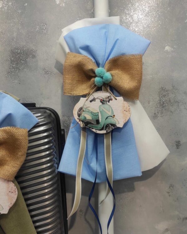 Πλήρες σετ βάπτισης μηχανή. Το σετ περιλαμβάνει στολισμένη τροχήλατη βαλίτσα ταξιδίου, στολισμό λαμπάδας (δεν συμπεριλαμβάνεται το κερί), μπουκαλάκι λαδιού, 3 κεράκια κολυμπήθρας, σαπουνάκι, λαδοσέτ, πετσέτα παππά και 50 μαρτυρικά.