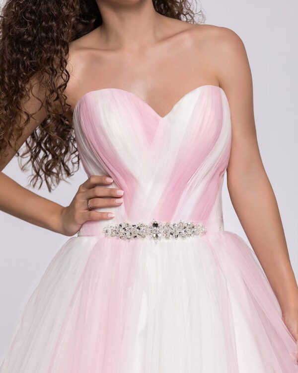 Στράπλες νυφικό δίχρωμο σε ροζ και off white από γαλλικό τούλι σε άλφα γραμμή. Λεπτομέρεια στο ζωνάκι με στρας και πολύ εντυπωσιακή πλάτη με κορδονάκι. Ένα ρομαντικό και πριγκιπικό νυφικό ιδανικό για νύφες που θέλουν θα κλέψουν την παράσταση! Πολλές νύφες μας, μας έχουν εμπιστευτεί και έχουν αγοράσει με τις συμβουλές μας το νυφικό τους online. Αν δεν είσαι σίγουρη για την εφαρμογή του μπορείς να κλείσεις ραντεβού για πρόβα στο [email protected] για να επισκεφτείς το φυσικό μας κατάστημα και κέρδισε 10% έκπτωση. Για οποιαδήποτε πληροφορία ή ραντεβού κάλεστε στο 22210 86623.