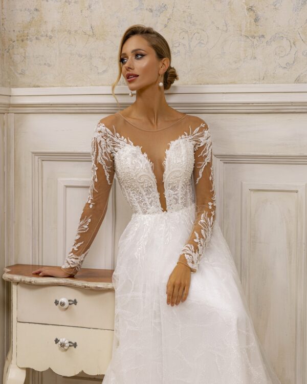 Πριγκιπικό νυφικό κεντητό με ουρά. Διαθέτει βαθύ μπούστο V με διαφάνεια και εντυπωσιακά μανίκια με κεντητές λεπτομέρειες.