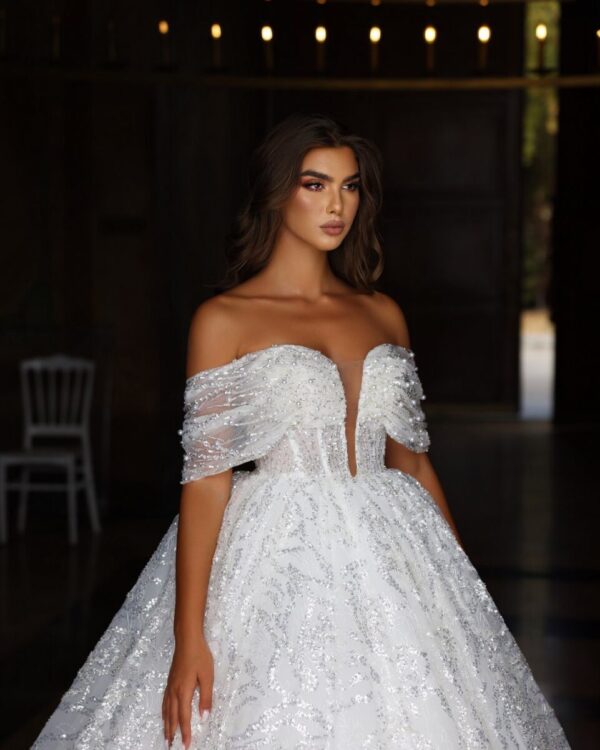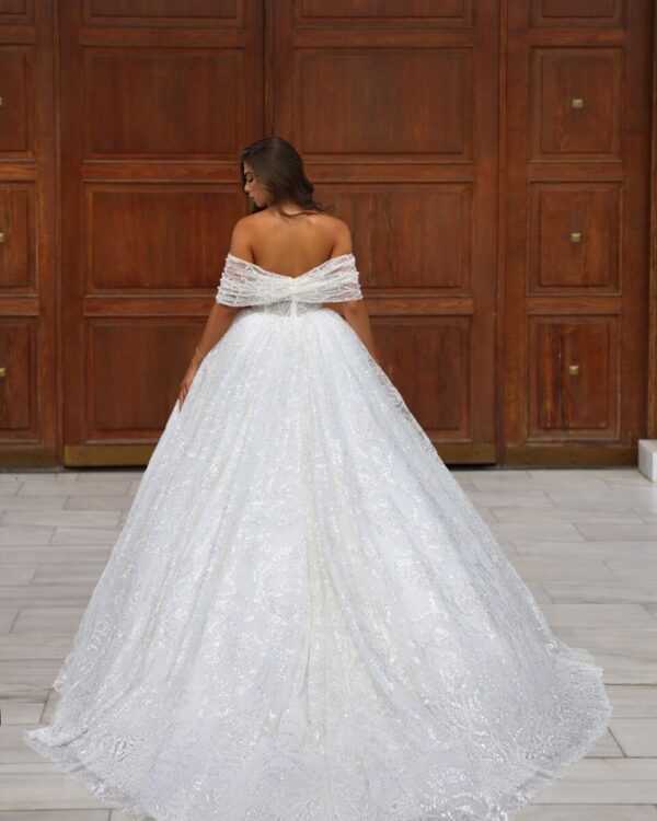 Ονειρεμένο νυφικό από γκλιτερ δαντέλα για νύφες βγαλμένες απο παραμύθι, ρομαντικό μανίκι αγκαλιάζει κομψά το χέρι και ένα υπέροχο βαθύ ντεκολτέ δημιουργεί απόλυτα θηλυκή εμφάνιση!