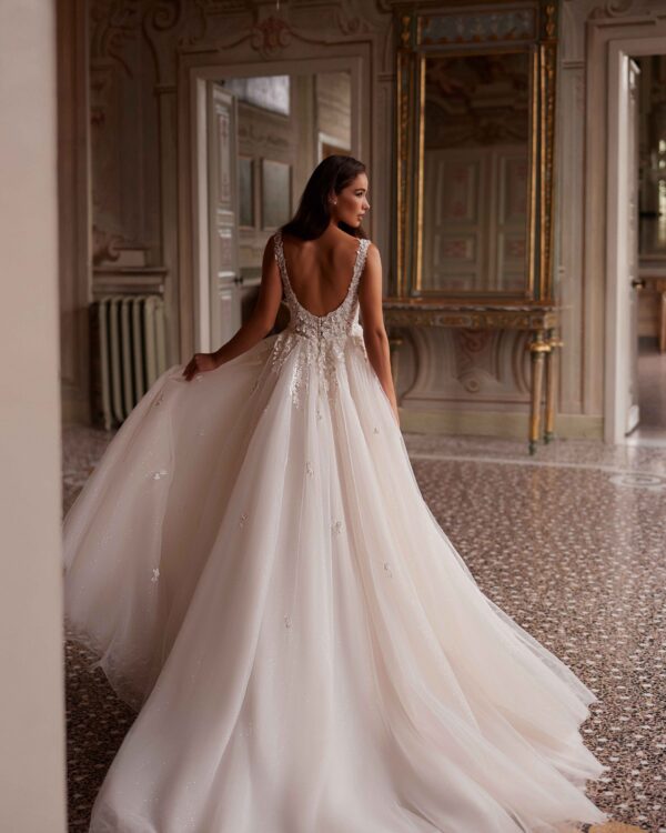 Πριγκιπικό νυφικό με σκίσιμο. Το βαθύ ντεκολτέ και η εφαρμοστή γραμμή τονίζουν τη θηλυκότητά σας. Με λεπτομέρειες δαντέλας στο μπούστο και τούλινη φούστα από γκλίτερ.