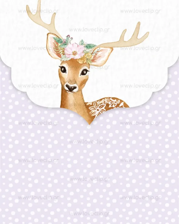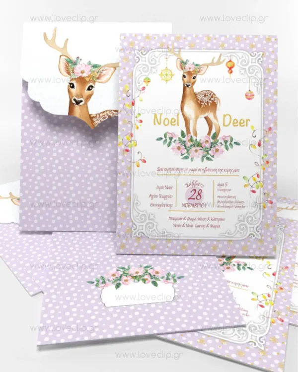 Προσκλητήριο με θέμα το ελάφι με φλοράλ διακόσμηση σε χειμωνιάτικο σκηνικό και χριστουγεννιάτικα στοιχεία.