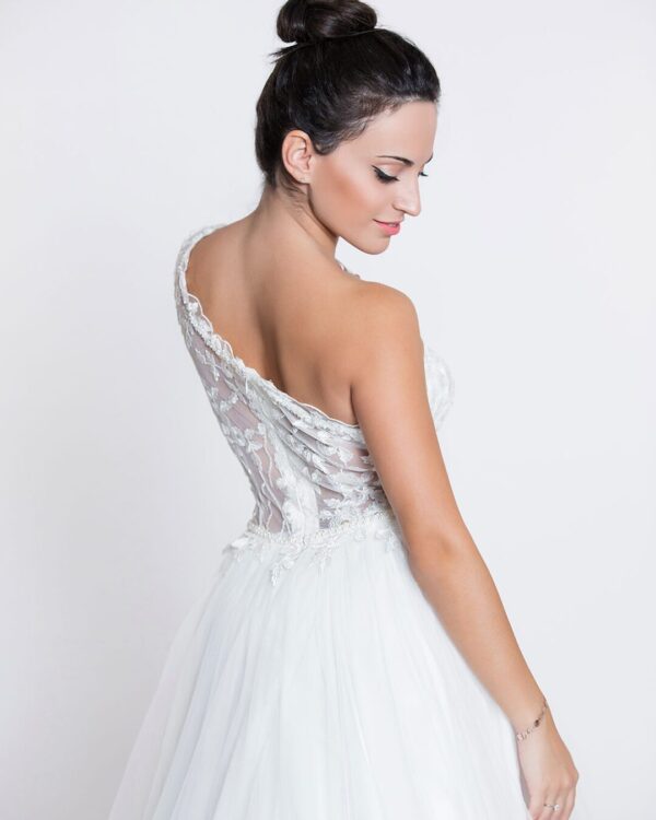 Ρομαντικό νυφικό από γαλλικό τούλι με ένα μανίκι, σε άλφα γραμμή και μπούστο κεντημένο με 3D δαντέλα. Το νυφικό είναι μοναδικό και είναι μόνο προς πώληση, ώστε να είσαι σίγουρη ότι θα είναι μοναδικά ξεχωριστό όπως σου αρμόζει. Όλα μας τα νυφικά προέρχονται από ευρωπαϊκούς οίκους μόδας. Ολοκαίνουργια νυφικά 2019 και διατίθονται μόνο για αγορά. Ανακάλυψε τα ιδανικά στέφανα για τον ονειρεμένο γάμο σου! Πολλές νύφες μας μας έχουν εμπιστευτεί και έχουν αγοράσει με τις συμβουλές μας το νυφικό τους online. Αν δεν είσαι σίγουρη για την εφαργαγή του μπορείς να κλείσεις ραντεβού για πρόβα στο [email protected] για να επισκεφτείς το φυσικό μας κατάστημα και κέρδισε 10% έκπτωση.