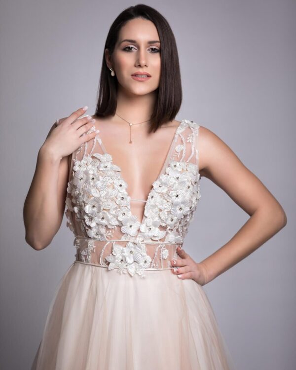 Ρομαντικό και σέξι νυφικό από γαλλικό τούλι σε άλφα γραμμή στο χρώμα της πούδρας με ολοκέντητο εντυπωσιακό μπούστο από 3D λουλούδια με swarovski. Υπέροχη ανοιχτή πλάτη σε V κόψιμο. Ένα πολύ εντυπωσιακό και ξεχωριστό νυφικό ευρωπαϊκής προέλευσης. Πολλές νύφες μας μας έχουν εμπιστευτεί και έχουν αγοράσει με τις συμβουλές μας το νυφικό τους online. Αν δεν είσαι σίγουρη για την εφαργαγή του μπορείς να κλείσεις ραντεβού για πρόβα στο [email protected] για να επισκεφτείς το φυσικό μας κατάστημα και κέρδισε 10% έκπτωση.