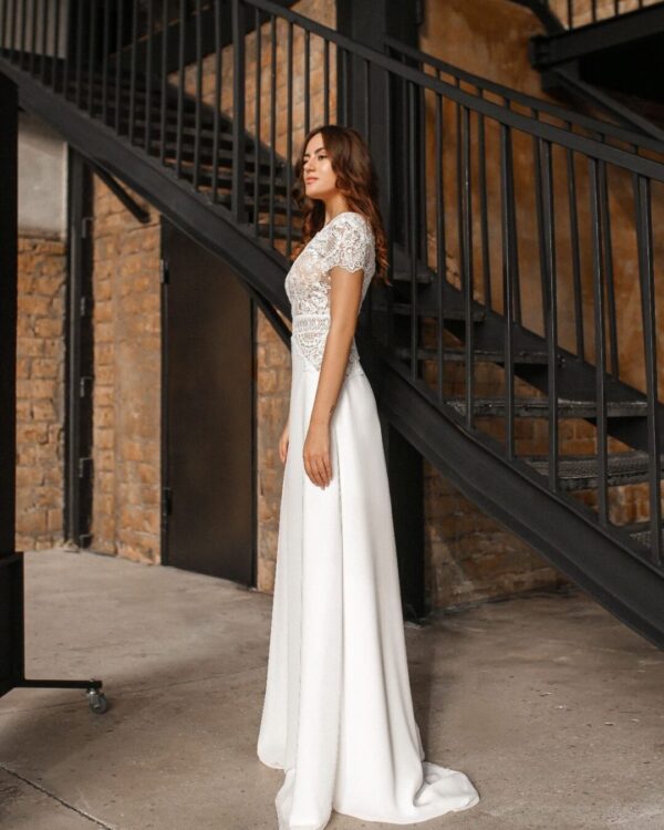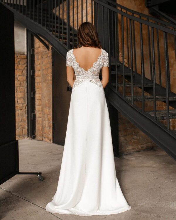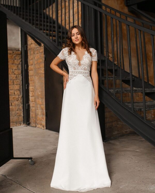 Ρομαντικό νυφικό με δαντέλα. Διαθέτει δαντέλα στο επάνω μέρος. Βαθύ μπούστο V και ανοιχτή πλάτη.